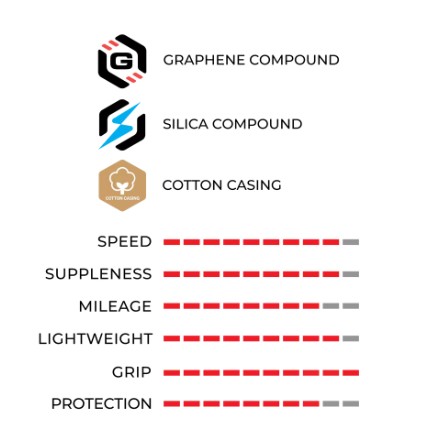 Ta napredna zmes zagotavlja izjemno hitrost in oprijem brez kompromisov, zato je najboljša izbira za tiste, ki zahtevajo najhitrejšo možnost od točke A do točke B. Zasnovan je z revolucionarno, v WorldTour preizkušeno tehnologijo spojin Graphene + Silica in brezčasno popolnostjo ohišja iz bombažne mešanice 320 TPI. Električno utrjen za odpravo šivov in izboljšanje aerodinamike. Corsa zagotavlja neverjetno prožno povezavo s cesto, pri čemer odpravlja kotalni upor ter vzbuja samozavest v razgibanih ovinkih.