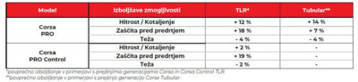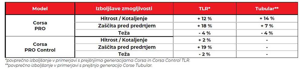 V primerjavi s prejšnjo različico zmagovalne Corsa PRO CONTROL nudi višjo hitrost, oprijem na mokrem in v ovinkih, največjo odpornost proti predrtju in udobje. Corsa PRO CONTROL uporablja najnovejšo zmes Vittoria iz grafena in silike ter nov postopek električne vulkanizacije, ki omogoča brezhibno nanašanje tekalne plasti na ohišje.