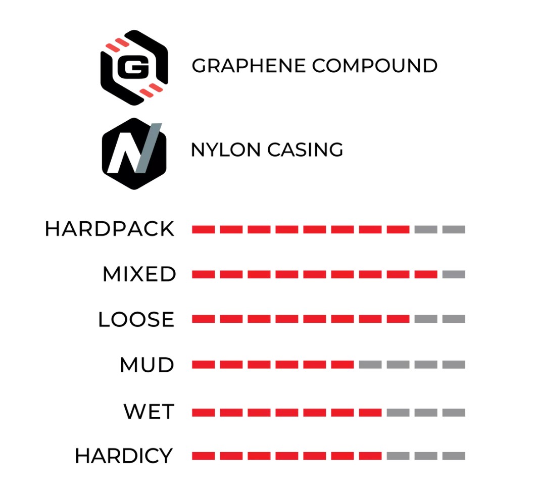 Zmes pnevmatike Terreno Mix, prepojena z grafenom, je bolj trpežna, hitrejša in lažja od same gume, ojačana pa je z izjemno trpežnim in prožnim najlonskim ohišjem Endurance z dodatnimi plastmi zaščite pred predrtjem na sredinski tekalni površini in stranskih stenah. Hitro vrteči sredinski čepi aktivno odstranjujejo umazanijo in blato, stranki čepi pa se zagozdijo pri zavijanju ali izven nagiba.